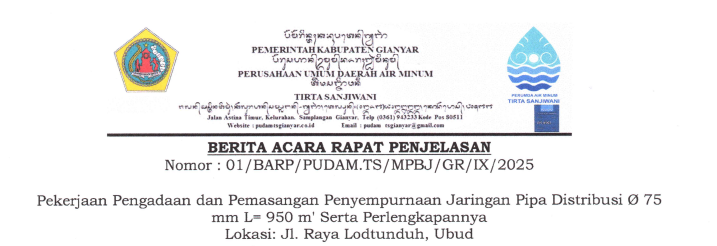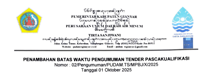 PENGUMUMAN TENDER PASCAKUALIFIKASI Nomor : 01/Pengumuman/PUDAM.TS/MPBJ/IX/2025 Tanggal 23 September 2025 Manajer Pengadaan Barang dan Jasa PERUMDA Air Minum Tirta Sanjiwani Kabupaten Gianyar akan melaksanakan tender dengan Pascakualifikasi untuk paket pekerjaan Konstruksi sebagai be