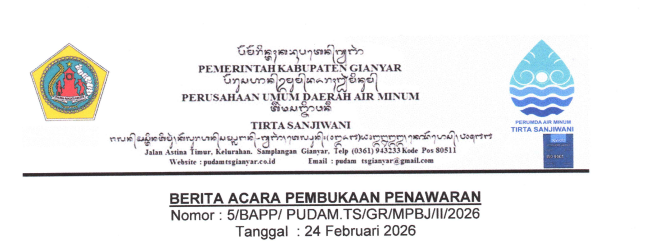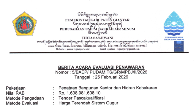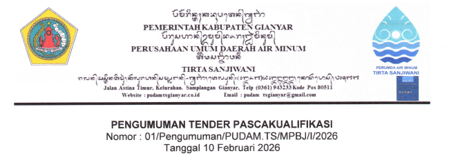 PENGUMUMAN TENDER PASCAKUALIFIKASI Pekerjaan Penataan Bangunan Kantor dan Hidran Kebakaran, Lokasi Kantor PERUMDA Air Minum Tirta Sanjiwani Kab. Gianyar