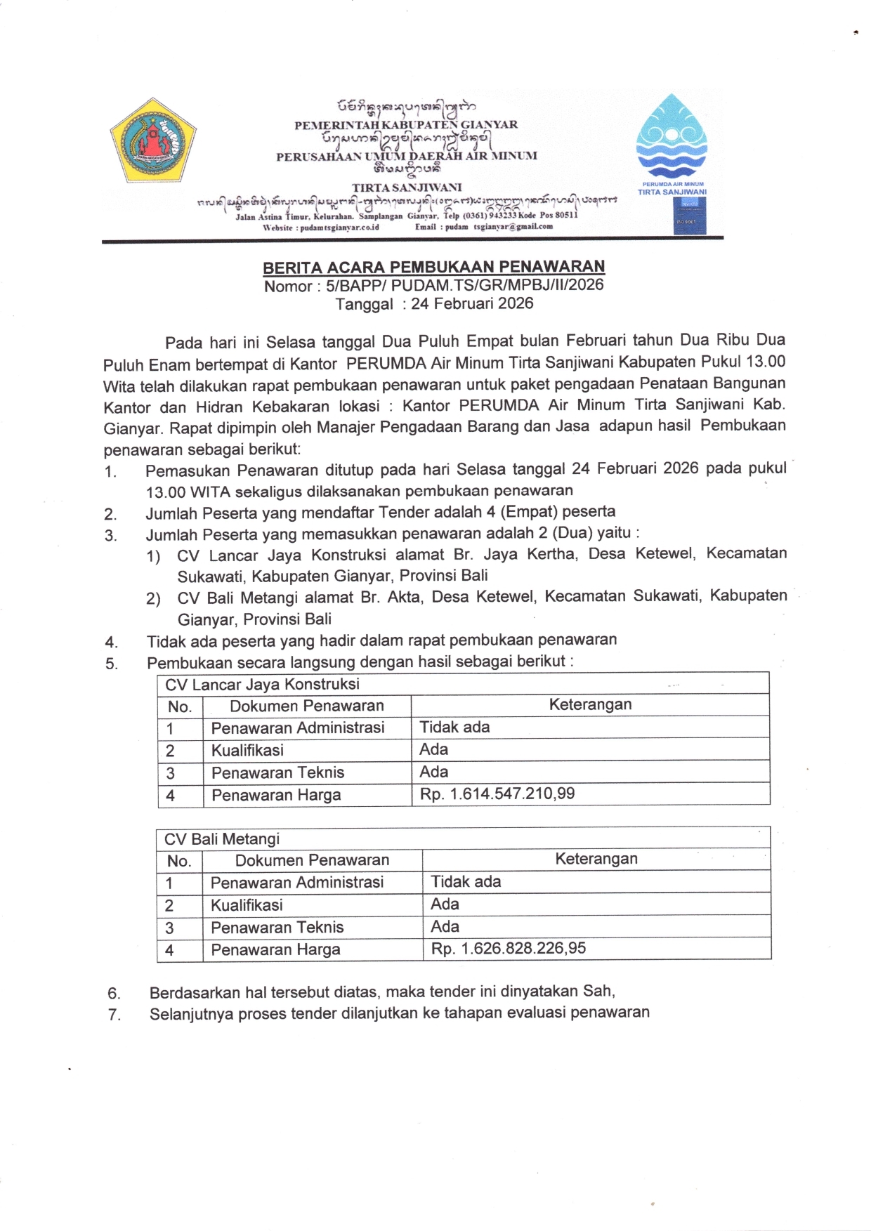 BERITA ACARA PEMBUKAAN PENAWARAN Paket Pengadaan Penataan Bangunan Kantor dan Hidran Kebakaran lokasi: Kantor PERUMDA Air Minum Tirta Sanjiwani Kab. Gianyar.