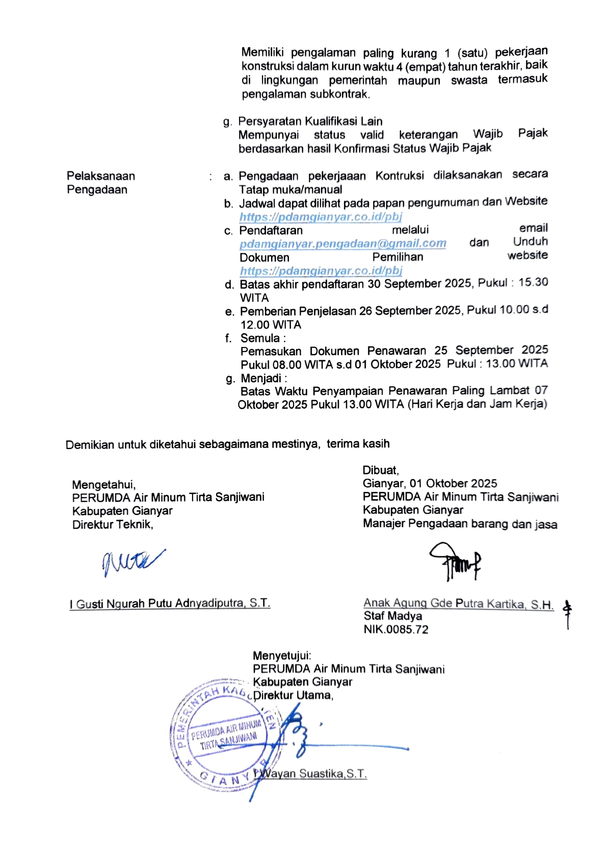 PERPANJANGAN KEDUA MASA PENDAFTARAN SELEKSI DEWAN PENGAWAS PERUMDA AIR MINUM TIRTA SANJIWANI KABUPATEN GIANYAR