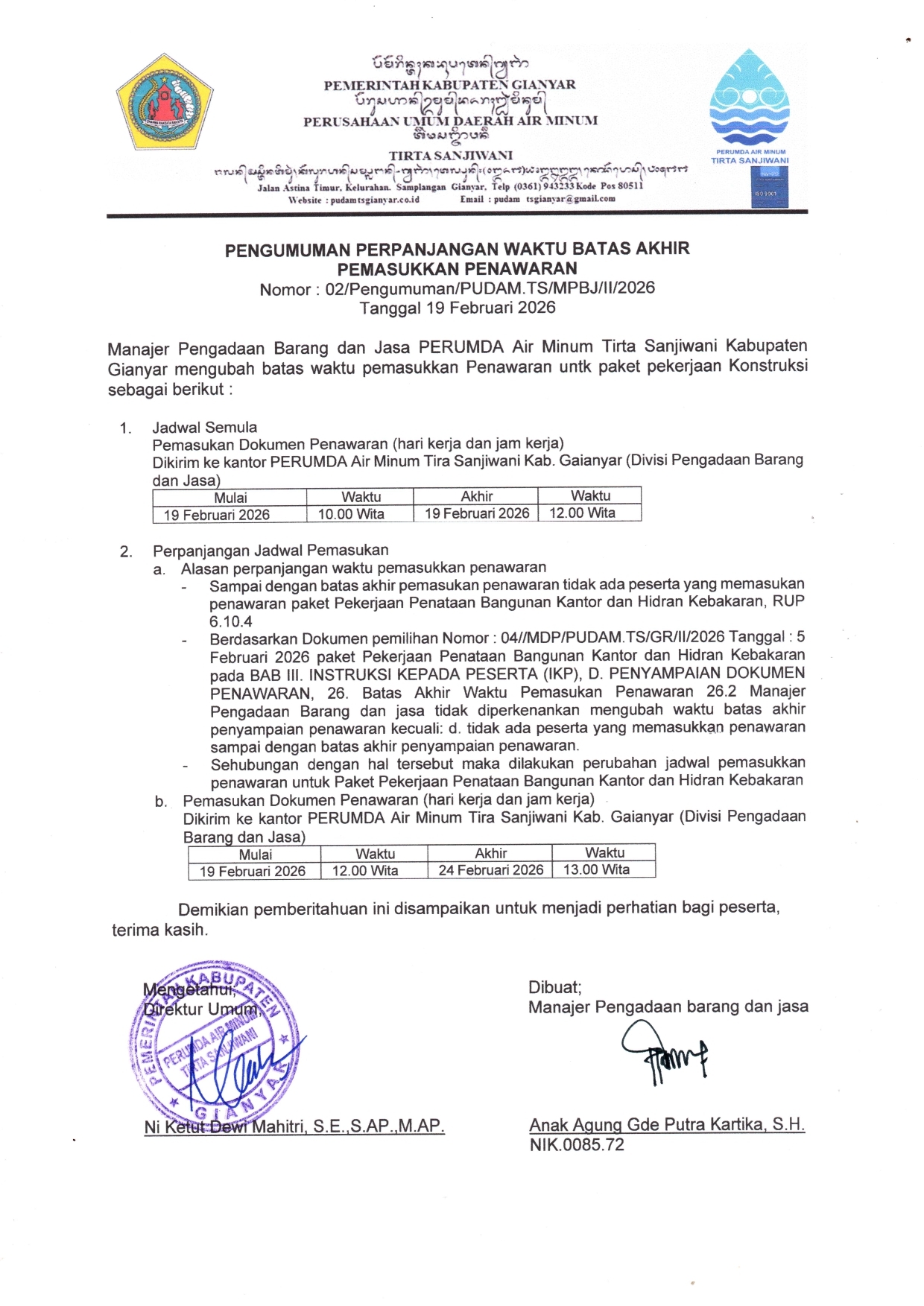 PENGUMUMAN PERPANJANGAN WAKTU PEMASUKAN PENAWARAN