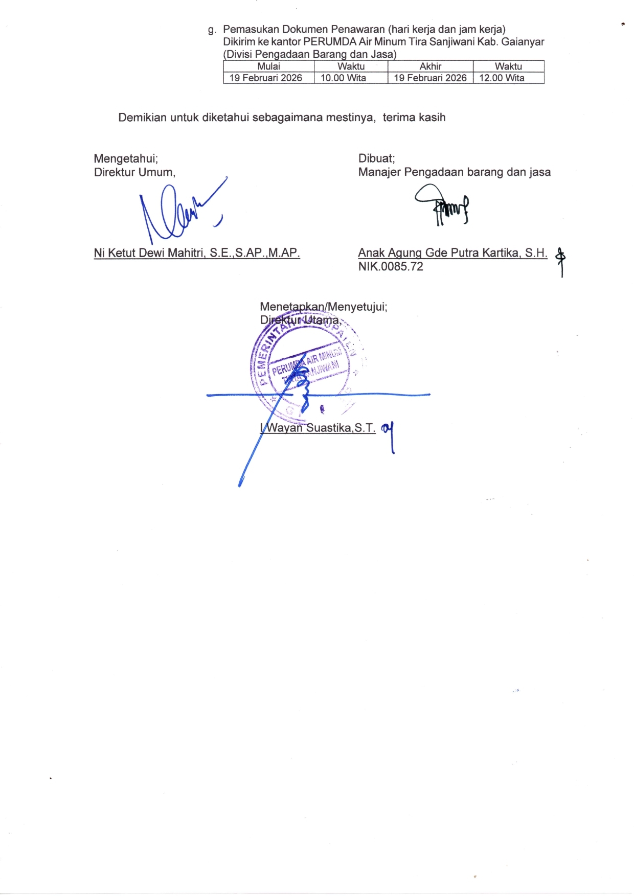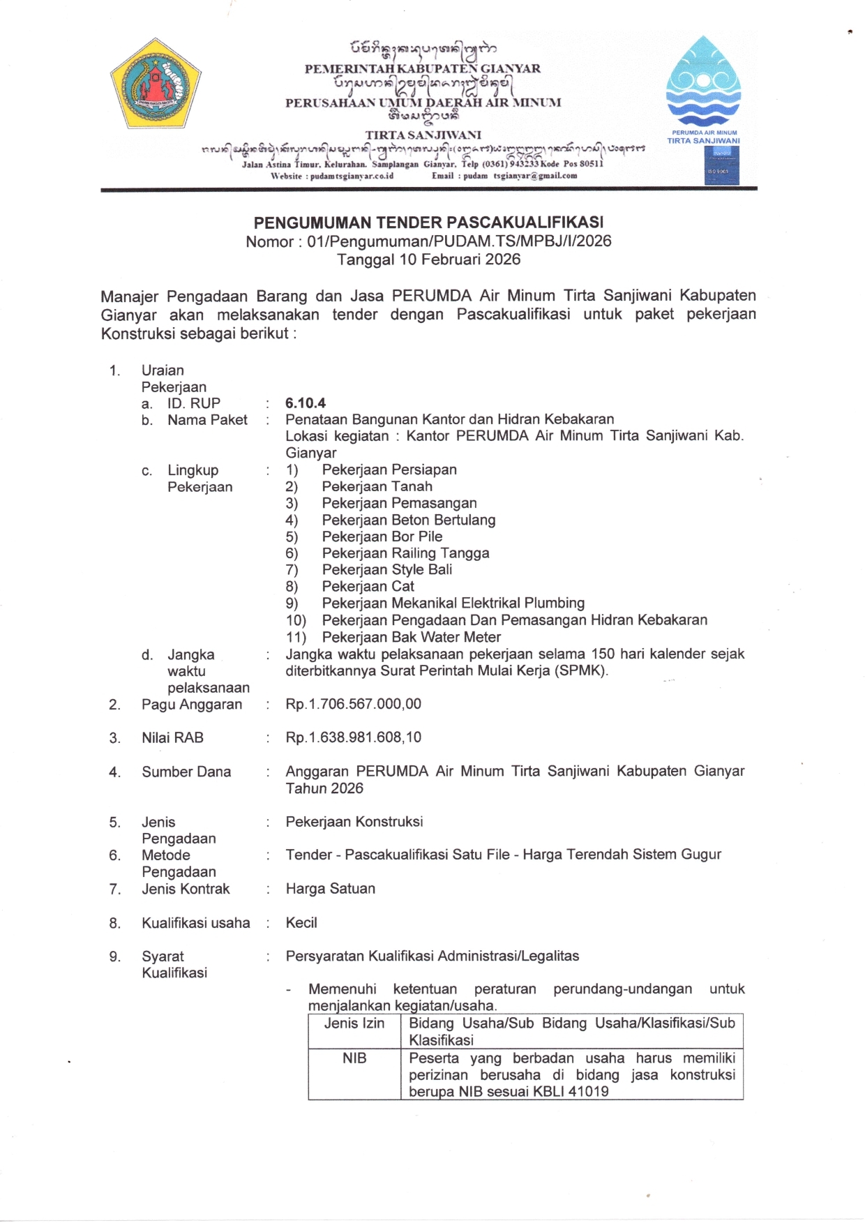 PENGUMUMAN TENDER PASCAKUALIFIKASI Pekerjaan Penataan Bangunan Kantor dan Hidran Kebakaran, Lokasi Kantor PERUMDA Air Minum Tirta Sanjiwani Kab. Gianyar